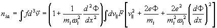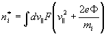 (3.7) где предположено, что плазма состоит из электронов и однозарядных ионов. На границах области скачка потенциала должно выполняться условие квазинейтральности, а распределение зарядов внутри слоя, как функция от Φ, определяется из решения уравнений движения частиц при заданных функциях распределения на границах. Решая задачу о движении частиц в заданном потенциальном поле, определяя зависимость nk от Φ при известном распределении вне слоя и подставляя найденные концентрации в (3.7), можно получить уравнение для потенциала, решение которого дает возможность определить величину скачка потенциала в слое ΔФ к энергию еΔΦ, приобретаемую частицей при пересечении слоя. В