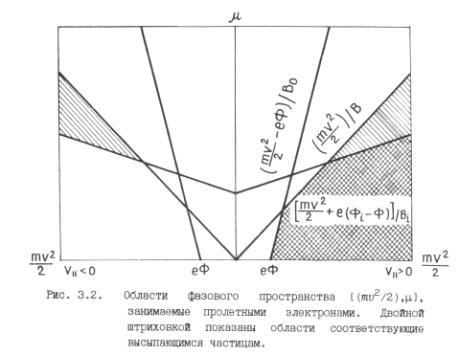 На рис. 3.2. двойной штриховкой показана область фазового пространства для высыпающихся частиц, одинарной отраженных магнитным полем и возвращающихся в исходную область, B0, Bi - напряженности поля в области начала ускорения и в области гибели электронов (ионосфере) соответственно. Ускоренные ионы ионосферного происхождения образуют ионный пучок. Задача о распределении потенциала вдоль силовой линии при решении уравнения (3.7) требует кроме учета четырех групп частиц, рассмотренных в § 2 (пролетные электроны из магнитосферы, пролетные ионы ионосферного происхождения, отражаемые слоем электроны ионосферы, отражаемые слоем ионы из магнитосферы), учета существования групп частиц, захваченных между скачком потенциала и магнитной пробкой. При этом, может быть получено решение со скачком потенциала, растянутым вдоль магнитной силовой линии при малом отклонении от квазинейтральности. Образующиеся