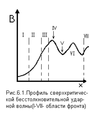 плотности плазмы благодаря отраженным от фронта ионам, III – «скачок» (ramp) магнитного поля – область
