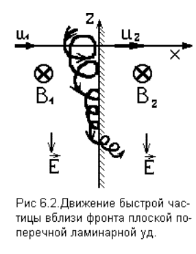 Заметим, что соотношение (6.3) не является следствием сохранения магнитного момента частицы, т.к. в данном случае не выполнено условие малости градиентов полей на расстоянии порядка ларморовского радиуса, и первый инвариант не должен сохраняться. Набор частицей энергии ограничен тем, что она только однократно пересекает фронт. Например, если B2/B1=4, то в нерелятивистском случае энергия частицы увеличивается в 4 раза, а в релятивистском – только в 2 раза. Эта эффективность может возрасти при распространении фронта в турбулентной среде. В случае параллельной ударной волны прирост при пересечении фронта равен нулю, т.к. регулярное поле перед и за фронтом волны отсутствует (E1=E2=0).