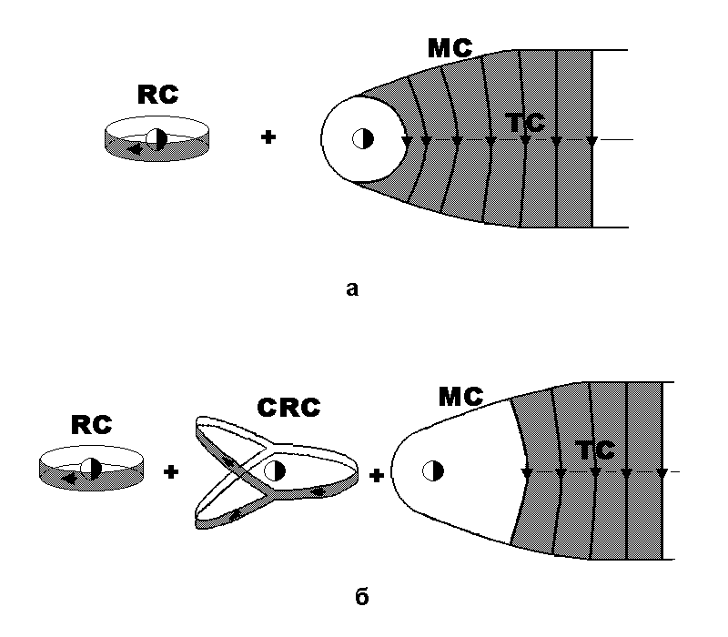 Традиционно обсуждаемая система магнитосферных токов (см. рис. 6 а), вносящих основной вклад в возмущение внутримагнитосферного магнитного поля, включает токи на магнитопаузе (MC), замыкающиеся на магнитопаузе токи хвоста (TC), кольцевой ток (RC) и продольные токи зон I и II (последние на рис. 6 не показаны). Во время подготовительной фазы суббури в ночные часы на геоцентрических расстояниях