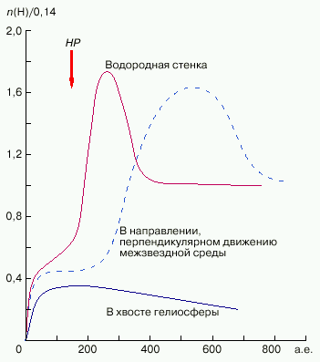 | Рис. 4.Рассчитанное теоретически распределение с подветренной стороны плотности атомов Н, движущихся из межзвездной среды. Пик этого распределения, находящийся вблизи гелиопаузы, положение которой отмечено через НР, назван водородной стенкой |