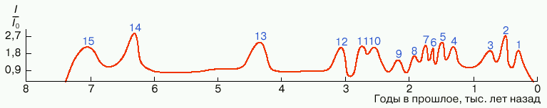 | Рис. 1. Временной ход концентрации радиоуглерода в годичных кольцах деревьев за последние 8 тыс. лет |