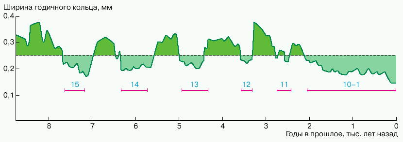 | Рис. 2. Прирост годичных колец деревьев на шкале времени последние 8 тыс. лет |
