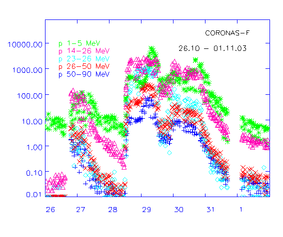 протонов с энергией > 90 МэВ во время серии магнитных бурь в конце октября 2003 г.