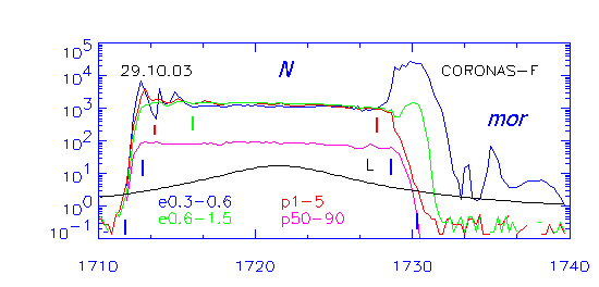 Верхний график относится к спокойному периоду, три дня до бури. Энергичных СКЛ нет, но