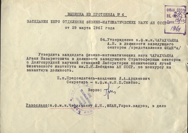 В 1964 г. А.Н.Чарахчьян А.Н. защитил докторскую диссертацию на тему «Исследование флюктуаций интенсивности