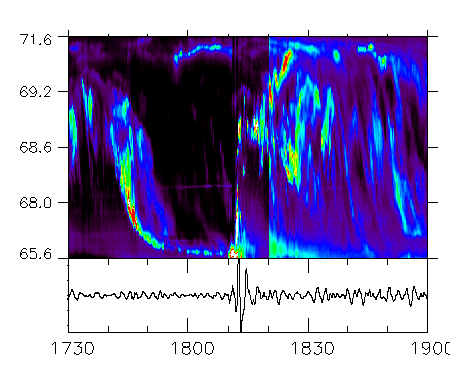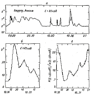 Общим источником и магнитных возмущений и полярных сияний на активной фазе суббури является высыпание в атмосферу авроральных электронов (см.), ускоренных в момент брейкапа. На рис. 5 приведены результаты измерения тормозного аврорального рентгеновского излучения в момент брейкапа в аэростатном эксперименте Баркуса на Аляске. Справа внизу дается график отношения двух энергетических каналос детектора, из которого следует, что в максимуме каждого всплеска происходит ужестчение спектра. Из многих типов АРИ брейкапу соответствуют короткие жесткие всплески подобные цепочке активизаций полярных сияний, показанной выше на рис 2.