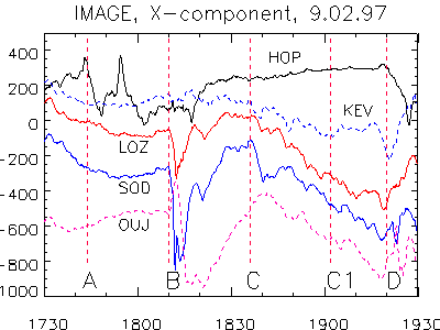 Рис 3. Магнитограммы X - составляющей (север-юг) магнитограмм нескольких станций авроральной зоны 9.02.97. Пунктирными вертикальными линиями обозначены моменты начал интенсификаций суббурь.