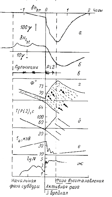 Если отсечь медленные вариации магнитного поля частотным фильтром, как это делается при регистрации магнитных пульсаций, в начале суббури мы увидим иррегулярные колебания с периодом порядка минуты, именуемые Pi2 . На рис 4