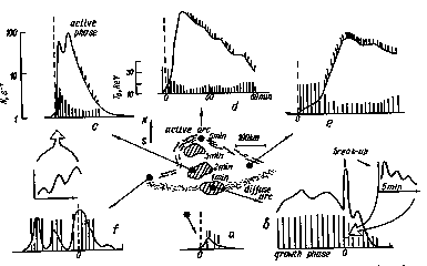 Брейкап состоит из нескольких активизаций длительностью 20 - 100с, рис.2 дает пространственную схему этого процесса. Собственно короткая и локализованная активизация и является проявлением элементарной суббуревой неустойчивости.
