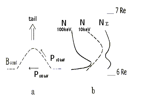 Рис 3.1 a) Схема движения замагниченных (10 кэВ) и незамагниченных (100 кэВ) протонов во время активизации. в) Начальное радиальное распределение плотности протонов до активизации и суммарное распределение в процессе активизации
