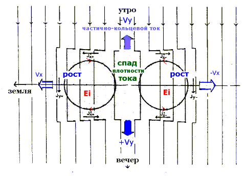Расщепление тока. Мы уже упоминали о том, что разрыв дрейфового тока физически представить не просто - даже быстрая диффузия ионов в конус потерь потребует минут, тогда как активизация развивается за секунды. Гораздо проще осуществить локальное уменьшение тока за счёт его расщепления, радиального сдвига. Наличие двух или большего числа популяций ионов разных энергий, замагниченных и не замагниченных, создаёт благоприятную возможность для расщепления.