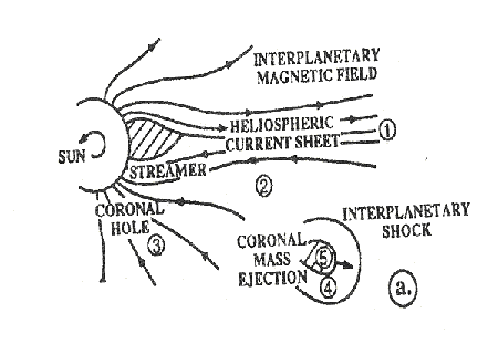 В работе Браво [Bravo, 1995] описан несколько иной сценарий. Всплывание нового фотосферного материала противоположной полярности, что само по себе является обычным явлением на Солнце, приводит к перестройке магнитных полей в солнечной фотосфере. Если это происходит вблизи коронального шлема или корональной дыры, то перестройка магнитного поля может привести к СМЕ, которое будет распространяться вдоль открытых силовых линий магнитного поля вплоть до орбиты Земли.
