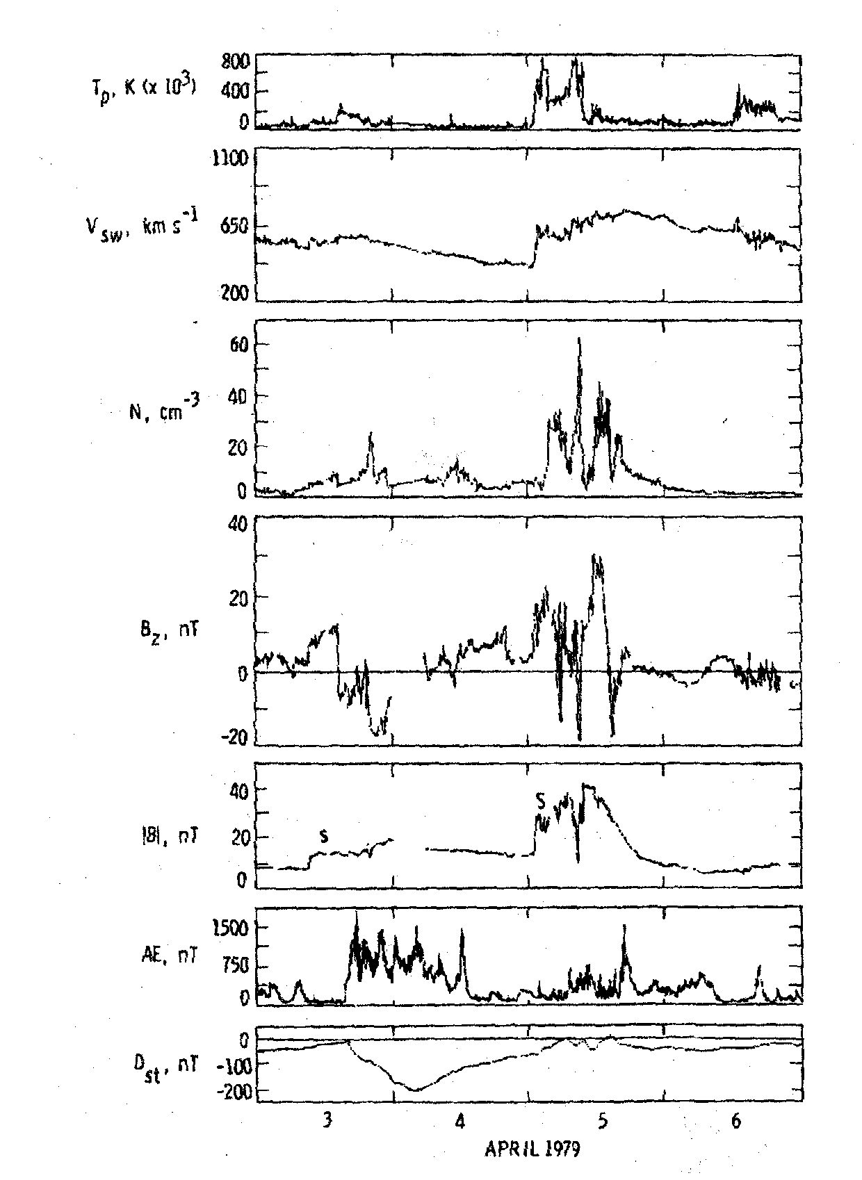 Рис 3. Типичное распределение параметров во вспышечном потоке [Tsurutani,Gonzalez, 1987].