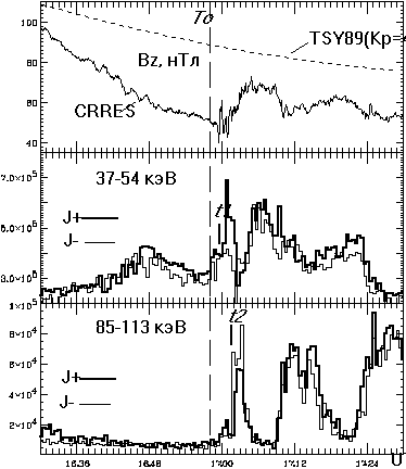 Рис.1. Суббуря 9 февраля 1991 по данным спутника CRRES, верхний график: сплошная линия - измеренная Bz компонента магнитного поля, пунктирная линия - Bz компонента, рассчитанная по модели Цыганенко-89 при Kp=4; средний график - дифференциальный поток протонов (см-2с-1ср-1кэВ-1) с энергиями 37-54 кэВ: J+ - частицы с гироцентрами ближе к Земле, чем спутник, J_ - частицы с гироцентрами дальше от Земли; нижний график - дифференциальный поток протонов с энергиями 85-113 кэВ.
