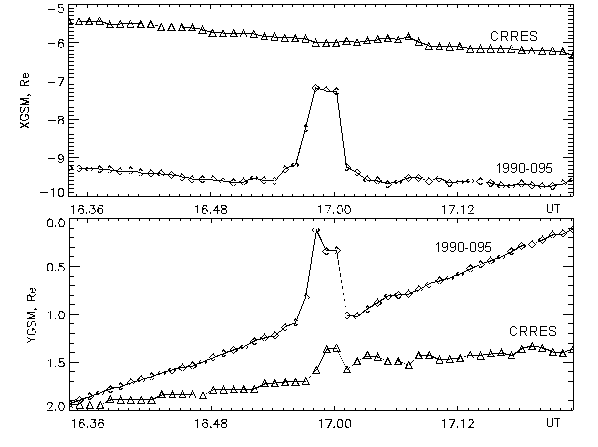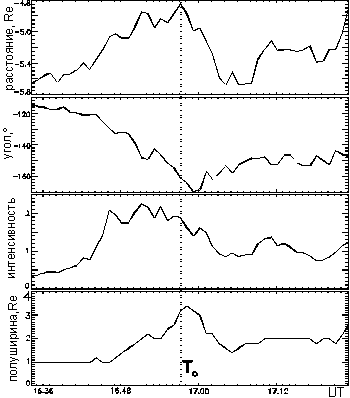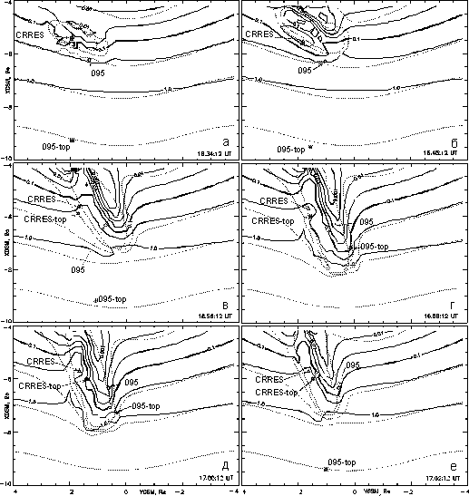 Как видно из рис. 5, в ходе суббури вершина силовой линии, проходящей через геостационарный ИСЗ 1990-095, оказывается то в более, то в менее адиабатичных областях, как и для CRRES. Однако в потоках частиц на ИСЗ 1990-095 имелись две особенности. Первая особенность - это "квазивыход" спутника в доли хвоста, который длился 2 минуты, начиная с 17.00 UT [Thomsen et al., 1994]. Напомним, что в это время спутник CRRES видит первую после начала суббури инжекцию менее энергичных протонов. Как видно из рис. 5 (панель "д"), в это время проекции обоих спутников на экваториальную плоскость оказываются вблизи токовой петли, но по разные стороны от неё. Разное поведение частиц на этих двух спутниках может свидетельствовать о локальности области источника частиц в начале суббури. Вторая особенность - запаздывание инжекции энергичных протонов на ИСЗ 1990-095 на 1 минуту относительно начала инжекции более энергичных частиц на CRRES. К началу инжекции силовая линия, проходящая через ИСЗ 1990-095, опять вытягивается в хвост (панель "е" на рис. 5). Учитывая положение вершин силовых линий, проходящих через CRRES и 1990-095, и временную задержку, можно сказать, что область ускорения частиц в начале суббури локализована, что первоначальное положение этой области было на ~ 6.3 Re (около CRRES), а затем она перемещалась в хвост со скоростью ~ 230 км/с.