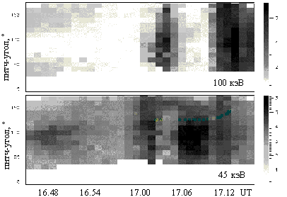 Рис.7. Питч-угловое распределение протонов в двух каналах во время суббури 9 февраля 1991 по данным спутника CRRES. Шкала справа - значения десятичного логарифма от дифференциального потока частиц.