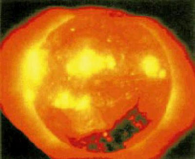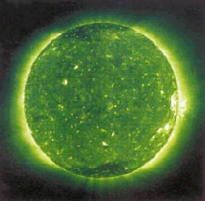 Рис. 2. Изображение горячей (1,5 x 106 К) солнечной короны, полученное в ультрафиолетовых лучах обсерваторией SOHO (Solar and Heliospheric Observatory), запущенной в декабре 1995 года, то есть в период минимума солнечной активности. Многочисленные яркие области - вспышки в короне - видны по всему диску Солнца. Совокупность вспышечных корональных петель на краю диска (справа) отражает эффект присутствия магнитного поля, силовые линии которого формируют анфиладу арок, образуя своеобразный туннель. Эти и другие данные, полученные SOHO, показывают, что Солнце непредвиденно активно даже в течение спокойной фазы 11-летнего цикла (из материалов NASA Resources for Educators). |