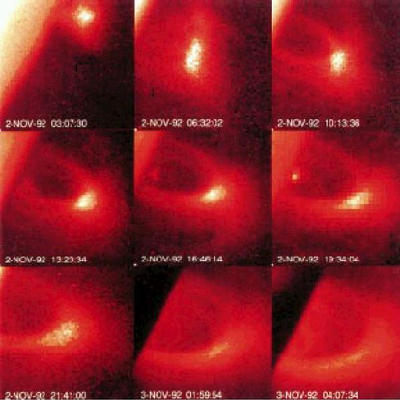 Телескоп мягкого рентгена впервые обеспечил возможность проследить динамику корональных петель. Эти петли в обычном, не возбужденном вспышкой состоянии представляют собой слабоконтрастные образования, которые не были доступны наблюдениям ранее. 2 ноября 1992 года удалось впервые пронаблюдать процесс образования петельной туннельной структуры, вершина которой периодически вытягивалась вверх и вновь замыкалась. Процесс оказался аналогичен процессу вытягивания хвоста магнитосферы Земли в ходе магнитной суббури. Удалось также проследить изменения петельной структуры активной области во время мощной вспышки (Рис. 4).