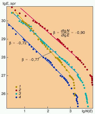 ,[3]. Энергетический спектр вспышек Солнца, то есть зависимость частоты вспышек с некоторой