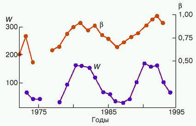 2 - максимум (1979-1982 годы); 3 - спад (1983-1985 годы), 4 - минимум 11-летнего цикла (1986-1987 годы). Наклон