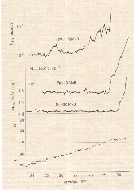 Более того, наблюдения за временным поведением частиц в межпланетном пространстве привели к открытию явления, - предвспышечного возрастания. Суть его в том, что в межпланетном пространстве задолго (от десятков часов до нескольких суток) перед регистрацией частиц с энергией в десятки и сотни МэВ отмечается возрастание частиц малых энергий, порядка 1 МэВ и меньше.