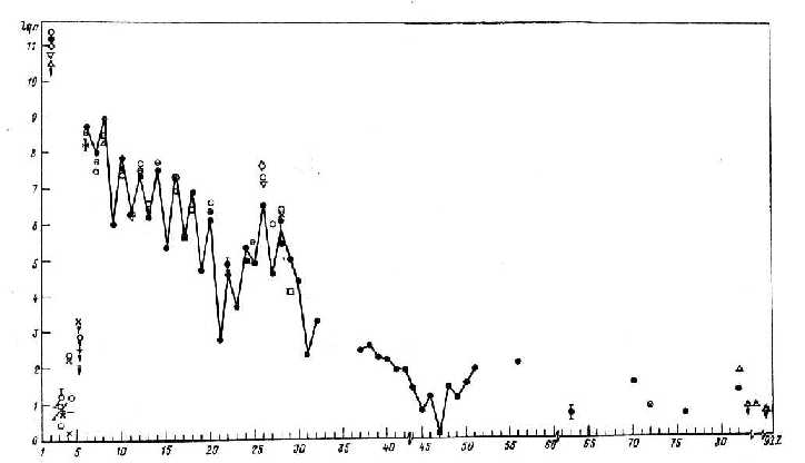 Рис.4  Распространенность химических элементов относительно водорода в атмосфере Солнца По оси ординат - десятичный логарифм относительной (по отношению к водороду) концентрации различных химических элементов. Логарифм концентрации водорода принят равным 12. Различными символами отмечены данные, полученные разными исследователями.