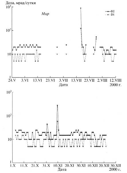 Рис. 1. Показания дозиметров аппаратуры Р-16 на орбитальной станции Мир в течение 2000 г.