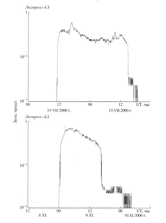 Одновременно, эти же два СПС были зарегистрированы дозиметром на ГС Экспресс АЗ, содержащем аналогичную ионизационную камеру, но имеющем более высокое 6-ти минутное временное разрешение [4]. Эти данные в зависимости от времени развития указанных событий приведены на рис. 2. Полная накопленная доза по показаниям дозиметра на спутнике составила 30.4 рад для СПС в июле 2000 г. и 28.6 рад для СПС в ноябре 2000 г.