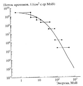 Рис. 3. Экспериментальные потоки протонов по дан-ным детекторов на спутнике GOES-8, усредненные для одного из 3-х часовых интервалов СПС в ноябре 2000 г. (горизонтальные линии), и дифференциаль-ный энергетический спектр потока протонов (кри-вая), полученный в результате аппроксимации этих экспериментальных данных.