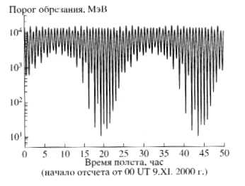 Рис. 4. Порог энергетического обрезания потока про-тонов космических лучей при проникновении на ор-биту ОС Мир в зависимости от времени развития СПС в ноябре 2000 г.