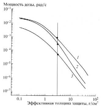 Рис. 5. Расчетные зависимости мощности поглощенной дозы от эффективной толщины плоской защиты (кривые) и экспериментальные данные для ГС "Экс-пресс A3" (точки) для ограниченных интервалов времени развития событий СПС. 1 - 3-6 UT 9.X.2000 г., 2 - 0-3 UT 15.VII.2000 г., 3- 0-3 UT25.IX.2001 г.