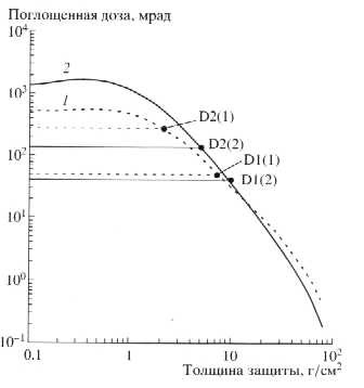 Для ОС Мир в соответствии с показаниями ее дозиметров D2 и D1 значения х оказались равны-ми 2.2 и 7.5 г/см2, соответственно. Этот результат понятен, если учесть, что дозиметр № 2 был направлен на внутреннюю обшивку базового блока ОС, а дозиметр № 1 (имеющий собственную дополнительную защиту) был направлен в противоположную сторону. Полученные результаты хорошо коррелируют с предыдущими оценками толщины защиты на ОС Мир [10] и с данными по динамике поглощенных доз, полученными в ходе многолетних исследований на ОС Мир [10, II].