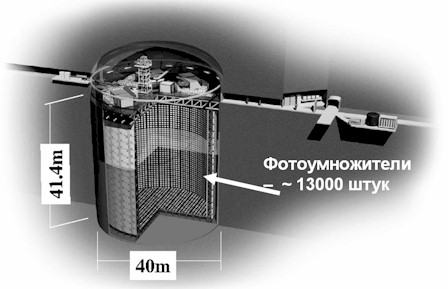 ![]() Рис.11.2. Super Kamiokande – крупнейшая нейтринная установка. Она представляет собой огромный бак, наполненный водой, окружённый тысячами детекторов, и опущенный глубоко под землю |