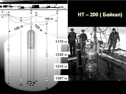 Наш Байкал – уникальный водоём с очень прозрачной водой. Там уже работает установка NT-200 - Neutrino Telescope – 200 (рис.11.4) Похожий эксперимент, DUMAND, создаётся вблизи Гавайских островов, на глубине 4.8 км. Ещё один, NESTOR (Neutrino Extended Submarine Telescope), планируется провести в Средиземном море вблизи Греции к юго-востоку от острова Пелопоннес. В установке NESTOR используются 12 “этажей” детекторов эффективной площадью около 20000 м2. Эта установка способна зарегистрировать нейтрино с энергией порядка 10 ТэВ.