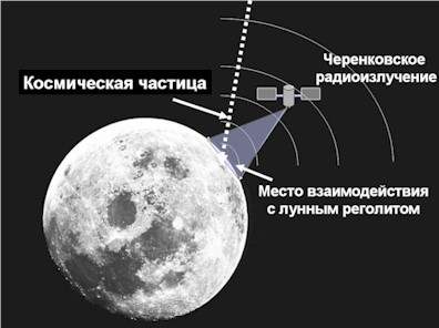 ![]() Рис. 11.6. Регистрация нейтрино по черенковскому излучению, возникающему в результате взаимодействия космической частицы (например, нейтрино) с лунным грунтом – реголитом. Черенковское излучение в радиодиапазоне может быть зарегистрировано приёмными устройствами на борту окололунного спутника |