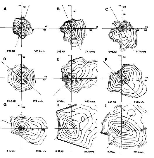 На рис SW2 приведены девять распределений по скоростям протонов по данным спутника Helios 2. Скорость СВ растет на рисунках слева направо, расстояние от Солнца уменьшается от верхних рисунков у нижним. С ростом скорости и уменьшением расстояния от Солнца растет анизотропия температуры протонов с максимумом вдоль вектора магнитного поля. Видно также появление вторичного высокоэнергичного пика. Искажения углового распределения вектора скорости солнечного ветра возникают в головной части скоростных потоков, там, где быстрый поток догоняет медленный. Высокие перпендикулярные скорости в солнечном ветре объясняются разогревом альвеновскими волнами.